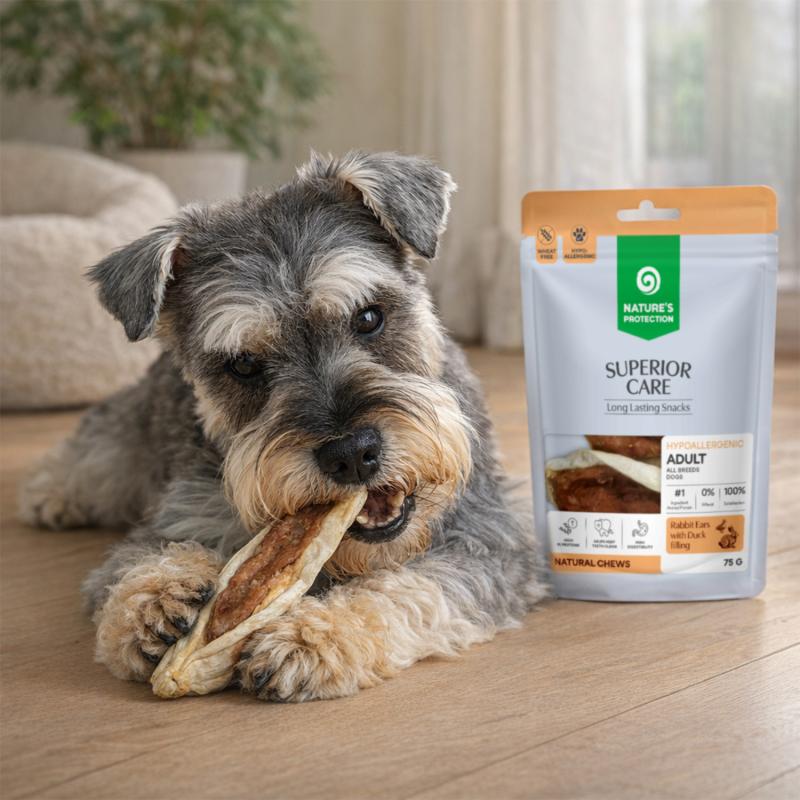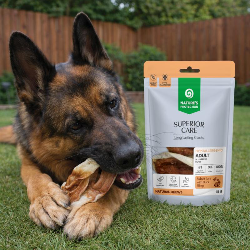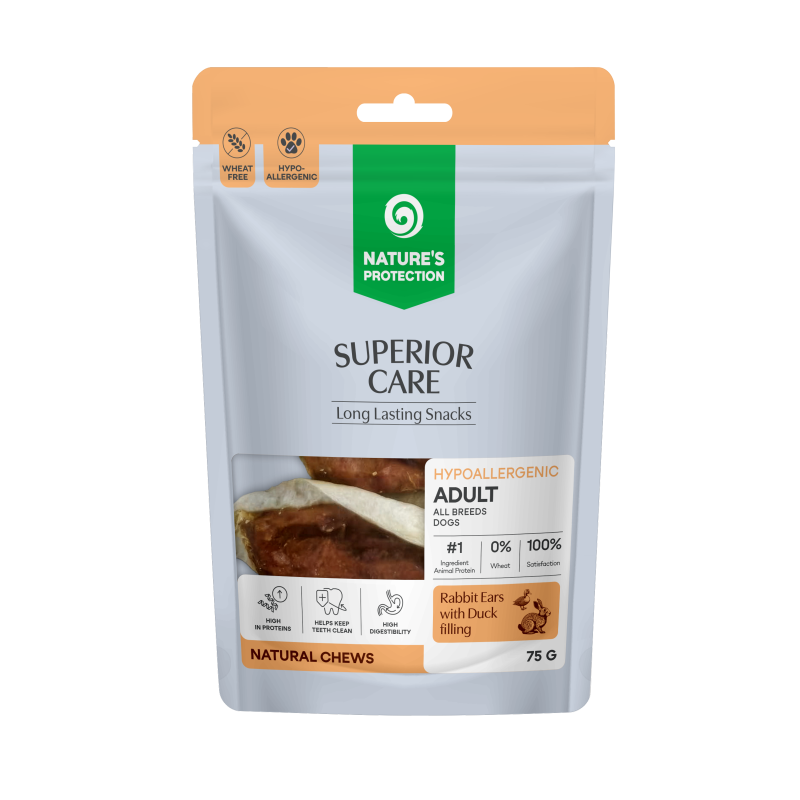 Nature’s Protection Superior Care treats for adult dogs of all breeds, rabbit ears with duck filling, are more than just a snack. It is a natural chew treat with a functional filling, designed for daily pampering and additional benefits – from dental hygiene to maintaining well-being.
